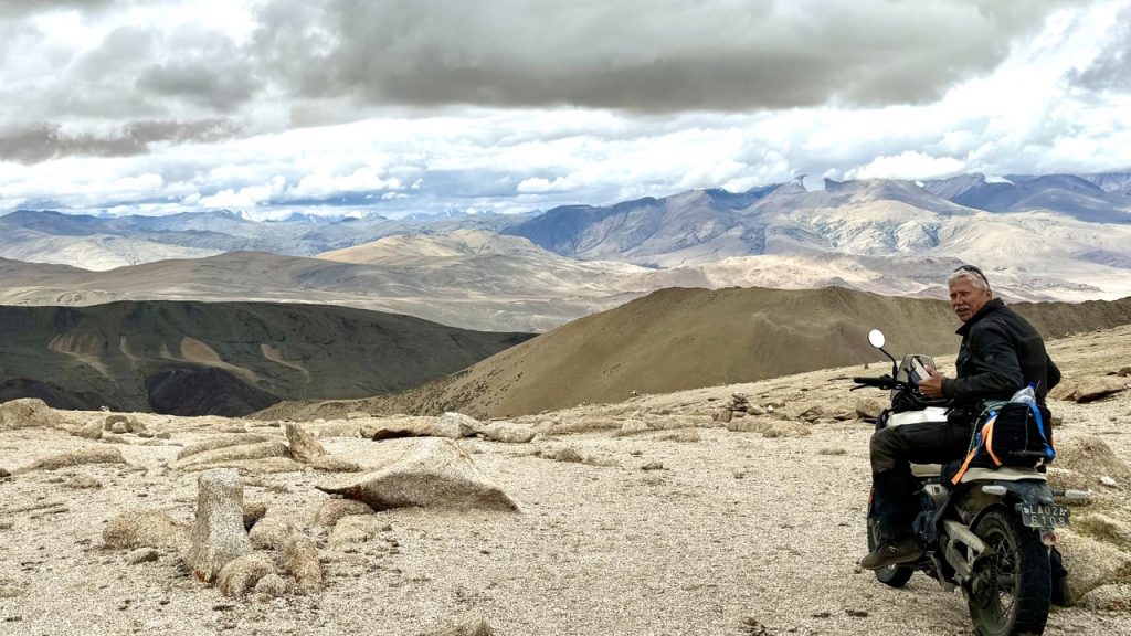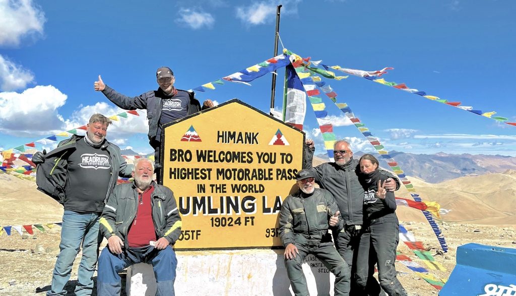 Wir sehen wahrscheinlich ein paar Kiangs – majestätische Wildesel – auf dem weiteren Weg über die Piste, bis wir auf die geteerte Straße am Fuße des Nurbu La kommen. Ein paar weite Schwünge später stehen wir schon auf dem Pass und genießen ein 360 Grad Panorama der spektakulären Art. Nun geht es in ein kleines Hochtal wieder nach unten bis wir an die Brücke zum Start des höchsten Passanstieges kommen. Unsere Himalayans müssen sich beim Schwingen bis auf 5.800m ordentlich ins Zeug legen, da die Motorleistung doch merklich nachlässt in der Höhe. Und dann stehen wir auf dem Gipfel, wo die Straße den Himmel berührt – wir sind 1000 m höher als der Mont Blanc in dünner Luft. Das Grinsen vom Gipfelphoto wird uns noch lange begleiten. Da auf der anderen Seite die Grenze nach Tibet liegt, drehen wir um und fahren die Route bis ins Tal zurück, das sich dann sehr idyllisch flussabwärts zieht. Noch steht uns ein fahrtechnischer Leckerbissen bevor: der Photi La, der genauso viele Kehren aufweist wie das Stilfser Joch auf der Nordseite – 48 an der Zahl. Auf 5500m haben wir noch einmal einen spektakulären Ausblick auf die mächtigen Gebirgsketten bevor es zurück nach Hanle ins Tal geht.