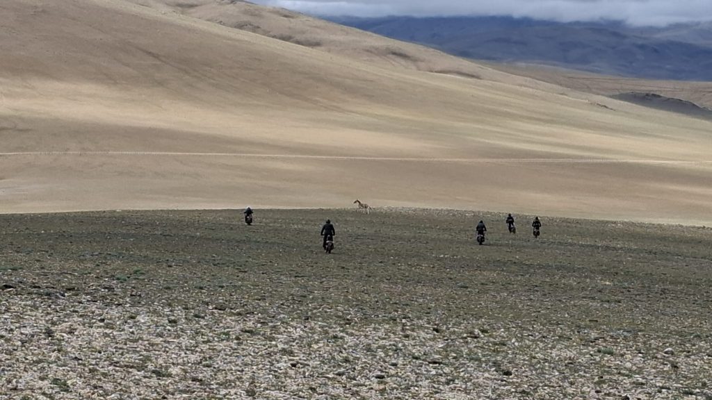 Wir fahren das weite Hochtal von Hanle bis zur Loma Bridge und dann immer in Sichtweite der Grenze zu Tibet entlang nach Chushul. Von hier geht es auf einen kleinen wenig befahrenen Pass, den Kaksang La, in die Höhe und wir genießen eine wunderschöne Strecke bis wir wieder ins Industal absteigen, das wir über die Mahe Bridge queren. Weiter geht es durch ein enges Hochtal nach Süden. Wir überqueren den Namshang La Pass auf 4.900 m um schließlich den Blick auf den azurblauen Tso Moriri See auf 4500 m Höhe zu werfen – unser heutiges Tagesziel. Hier ist mit Korzok die einzig größere Siedlung weit und breit (ca. 50 Häuser) und die Gegend ist noch viel einsamer, wilder und rauher als am Pangong Tso. Am unteren Tso Moriri sind wir inmitten des ladakhischen Nomadengebietes. Die Nomaden, von denen viele ursprünglich vor der chinesischen Okkupation Tibets nach Ladakh geflohen sind, ziehen im Sommer hier ohne Grenz mit ihren Herden umher, denn Tibet ist auch hier nur ca. 20 km entfernt. Im Winter, wenn es bis zu -30 Grad gibt, ist es oberhalb von 4.200 m doch etwas zu kühl –  selbst für ein gut gepolstertes Yak.